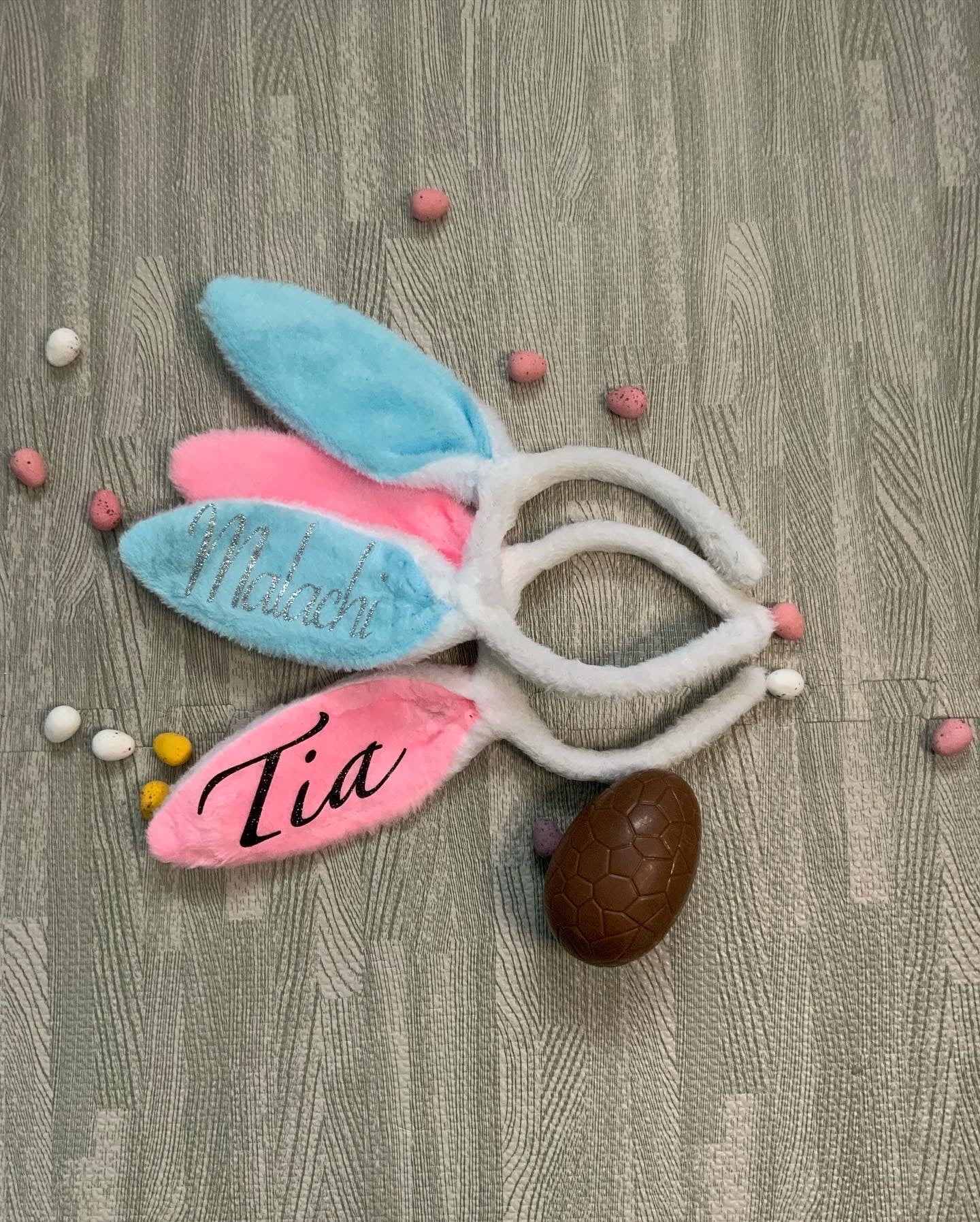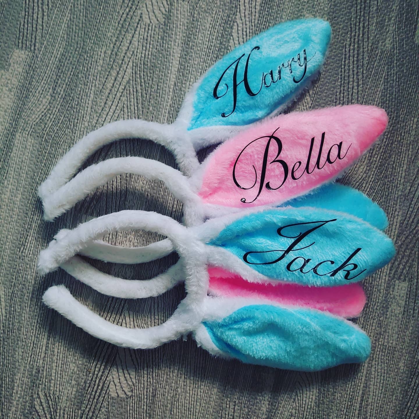 Pink or blue bunny ears with personalised name on.